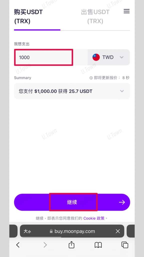 4.進入Moonpay輸入支付USDT的金額,點擊繼續