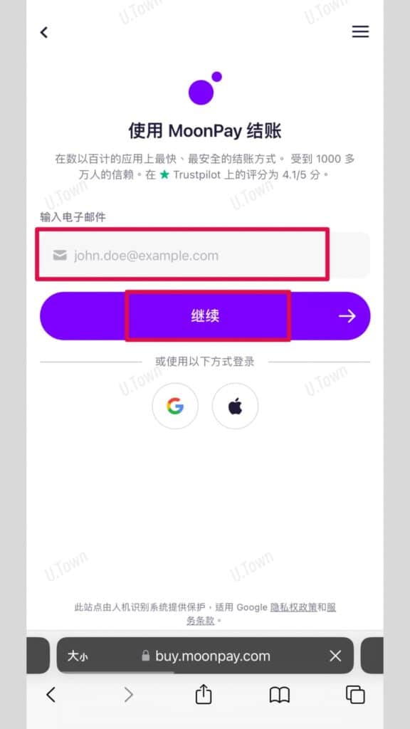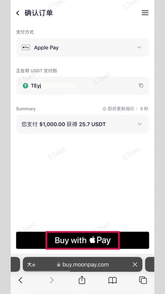 U.Town網站提供MoonPay刷卡購買USDT,您可以直接在網頁上刷卡買幣遊玩。