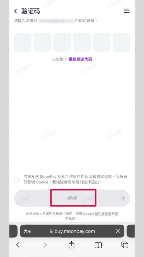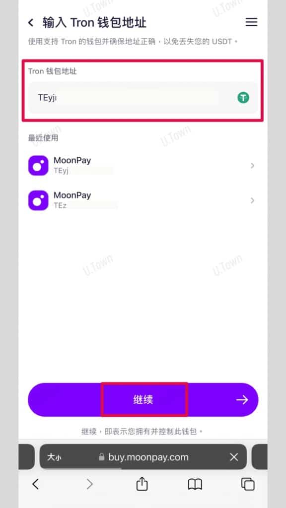 7.貼上步驟三複製的U.Town錢包地址,點擊繼續