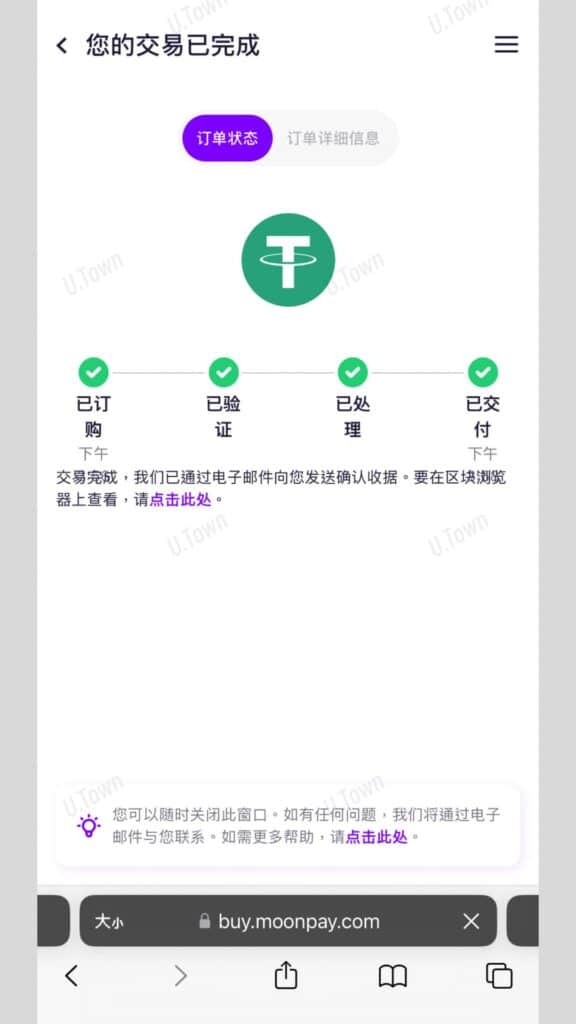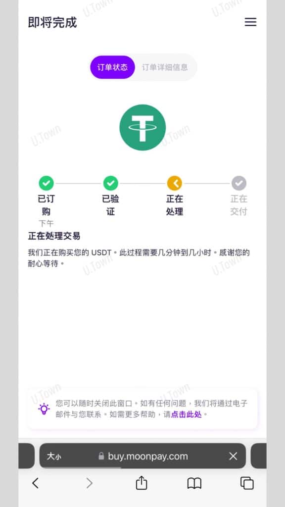 9.支付後等待訂單處理,平均時間十分鐘左右即可處理完成,若要取得訂單的最新處理資訊,請至您的郵箱查看MoonPay寄送的最新狀態信件