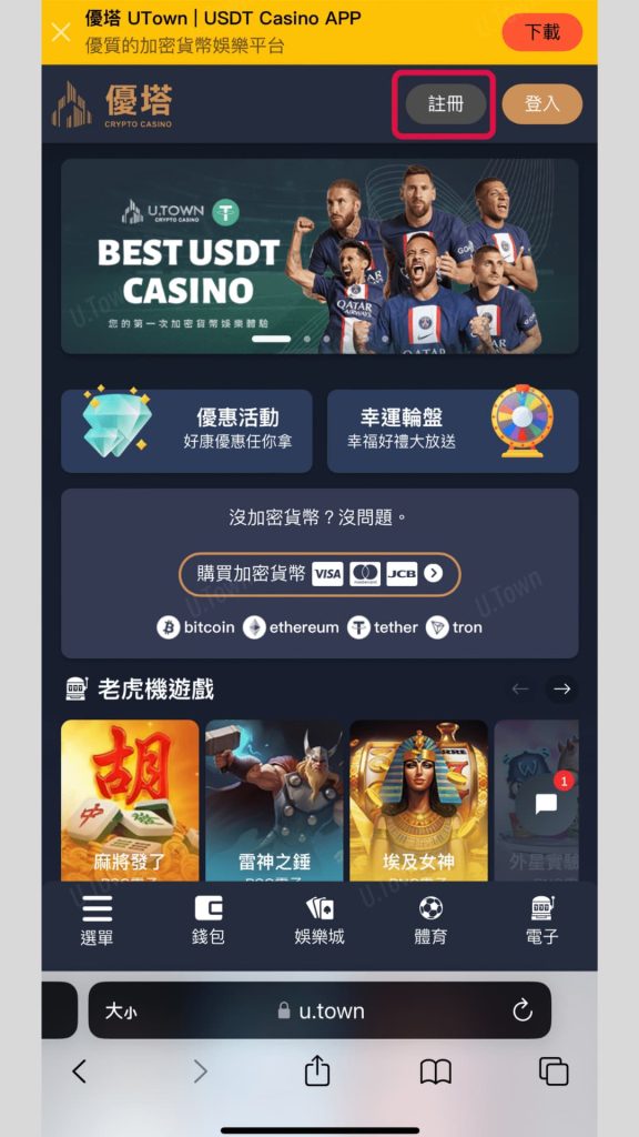 1.進入U.Town網站,點擊右上方灰色註冊按鍵