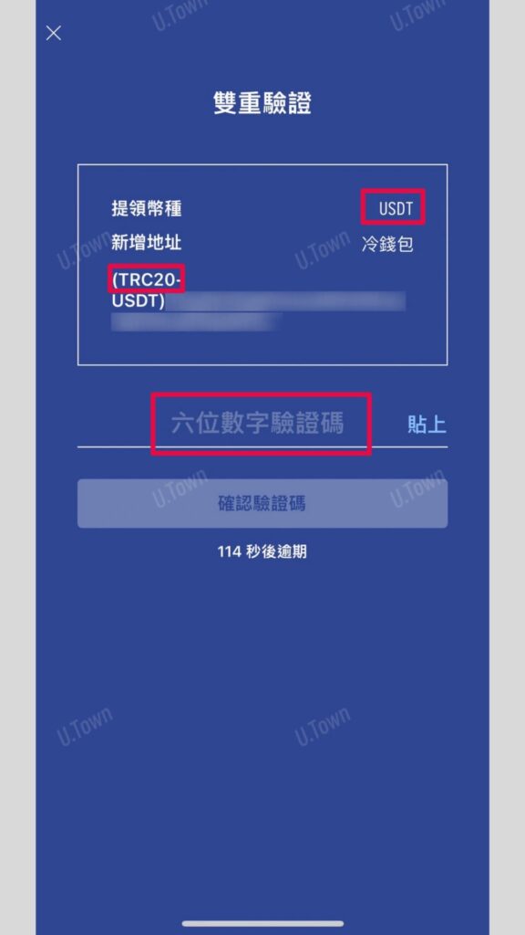 7.貼上U.Town入金錢包地址,錢包名稱填寫冷錢包,交易類型選擇TRC20