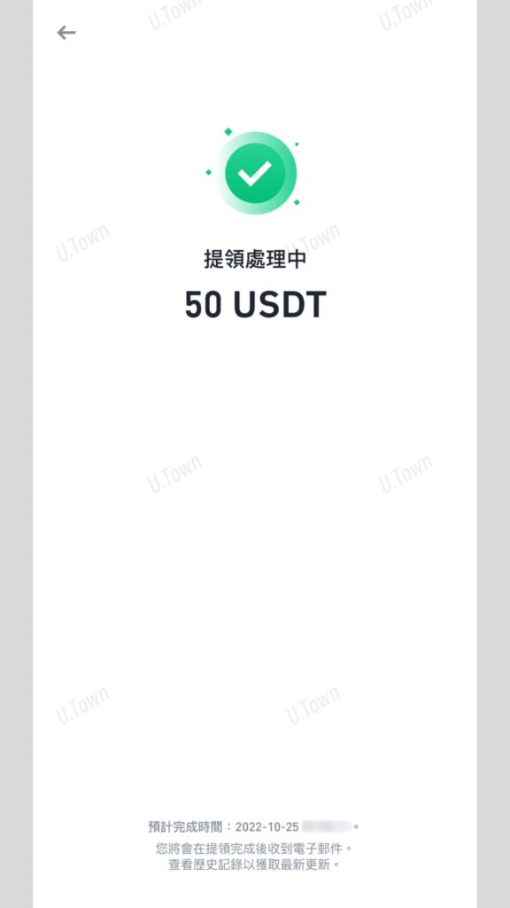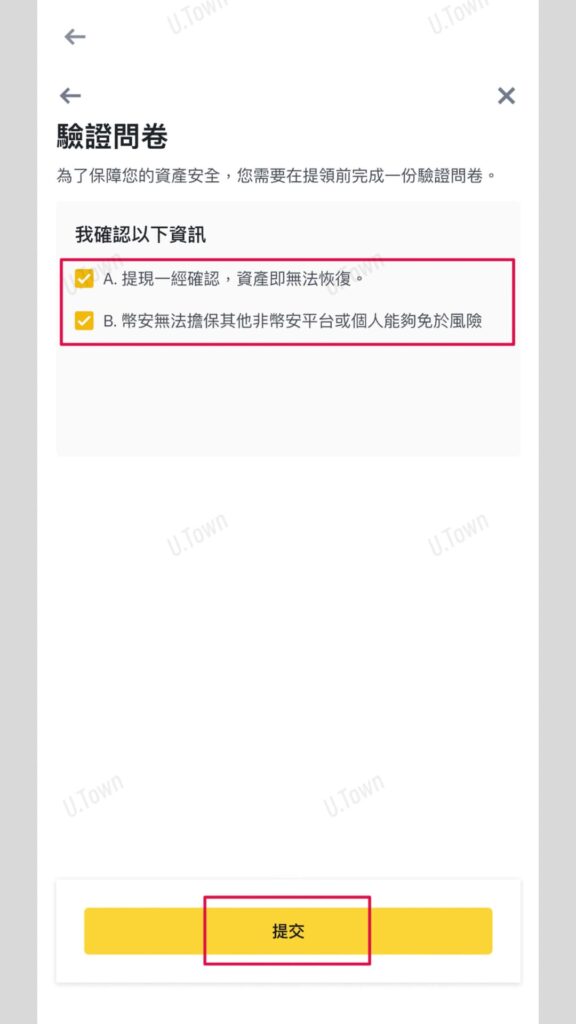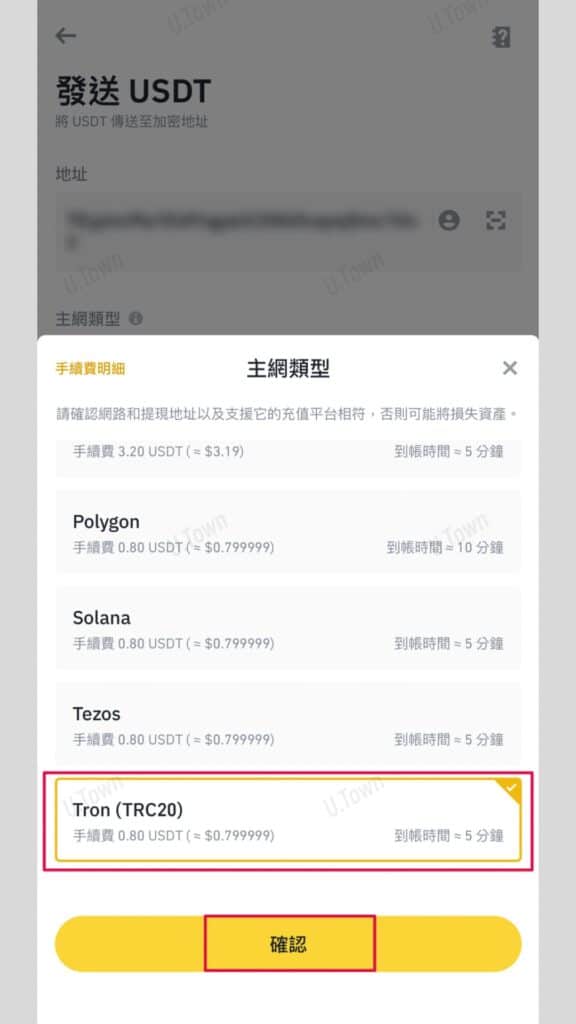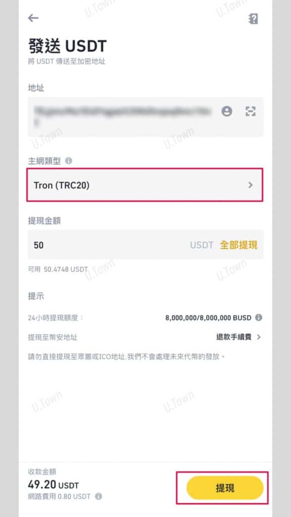 5.貼上U.Town入金錢包位置,主網類型選擇TRC20
